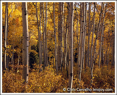 When I see an aspen grove aflame with the colors of autumn, I feel invited to walk among the trees and take in its golden glow. In Utah, the conditions in 2001 were not the best; there was a freak snowstorm in spring that burned some of the new growth. But there were small pockets of color. I found one near Kolob reservoir on a sunny afternoon drive. As the sun sank lower in the sky this grove lit up in billowy columns of fiery yellows, in the supportive embrace of a passel of slender, black-flecked trunks with the texture of soft, creamy satin. The depth and complexity of pattern in an aspen forest creates a magical pull that draws me in to explore and appreciate what it has to offer. When I leave there is a sensation of passing through a mysterious boundary. Something seems to stay behind, a feeling without words that can only be experienced while among the trees.