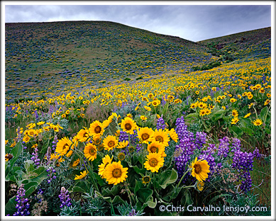 The east end of the Columbia Gorge is a completely different world from the wetter region of the west. Here the land opens up to an infinite sky and Oregon white oaks root together in isolated groves along with the occasional Ponderosa pine. The windswept countryside, though parched and brown in summer, is a riot of color in the spring. From miles away one can see hillsides splashed with the yellows of balsamroot or desert parsley and the deep blue of lupines. This view is in Washington's Columbia Hills Natural Area Preserve near The Dalles. On a particularly lovely afternoon I had thin high clouds that provided diffuse light and nearly windless conditions, perfect for photography. When sitting quietly in a spot like this I'm made deeply aware of how blessed we are to have this magnificent scenery to marvel at and draw from to restore the soul. I'm also made aware of our responsibility to protect these landscapes to enjoy forever. The vista you see here is quite tangible, yet what's difficult to quantify is understanding how to weigh the value it has in its unspoiled state compared to interests that wish to exploit the land for economic benefit. In a nutshell, this is the conundrum central to preserving the Columbia Gorge for future generations. While the land in this photo is protected, I can turn the camera from the northern view here to the east and see a slow, inexorable approach of wind turbines moving westward like a strange forest of manmade trees with spinning aluminum blades. It's a sickening spectacle to watch. They are the product of policies that encourage renewable energy without considering the cost of destroying the untouched views of the landscape that become harder to find with each passing year. While I think that carbon-neutral energy is a good idea, it is not without impact and to adopt it at the pace we have fails to consider the more complicated picture of whether we can take other measures to conserve energy and reduce our demand for it without building so many of these monstrosities. The growth in our energy demand is considered inviolate and no one is allowed to question it. 2011 is a special year because it's the 25th anniversary of the Columbia River Gorge National Scenic Area Act. While visionary back in 1986, now it shows signs of strain as technology and development interests have had time to develop strategies that reduce its ability to protect the region. When the act was written no one knew about wind turbines and the impacts they create. Today it's perfectly legal to place a 400-foot wind turbine tower just outside the scenic area boundary. The impact it would have inside the boundary is exactly the same, yet the law is powerless to stop this flagrant abuse of the spirit of the legislation. Sadly, I hiked to the summit of Dog Mountain in the central Columbia Gorge on May 10, 2011 and now the turbines are visible from the upper third of the trail. The scenic character of the Gorge has been changed for at least the next generation and it seems to have happened overnight. I called Portland General Electric, whose turbines are responsible for this, and removed the "green energy" payment from my power bill that I'd paid faithfully for years, trusting them to be good stewards of my dollars. The only way we will learn how important these places are is to make sure more people see them and understand how our growing population, approaching seven billion later in 2011, and its appetite for energy slowly steal them from us, bit by bit, until no one remembers what we've lost. We all need to ask questions of the authorities that approve development projects, rather than trust that government has our best interests at heart. Dollars are a poor yardstick to gauge the importance of untouched natural beauty. Photographs are better, but the best way I've found is to sit in a meadow, watch, listen, smell, and feel the sun and wind on my skin.